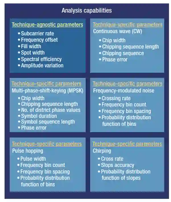 分析过程可以分成两个步骤: (1)分析与技术类型无关的参数,和(2)分析技术特定的参数。第一类包括诸如副载波率、中心频率偏移、填充宽度、斑点宽度(覆盖率)、光谱效率和光谱振幅变化等参数,它们适用于我们团队可能分析的任何波形。第二类包含一个更广泛的参数列表,根据波形技术的不同,可以分为五个子类别。目前在每个子类别中可以分析的参数的完整列表见图3。