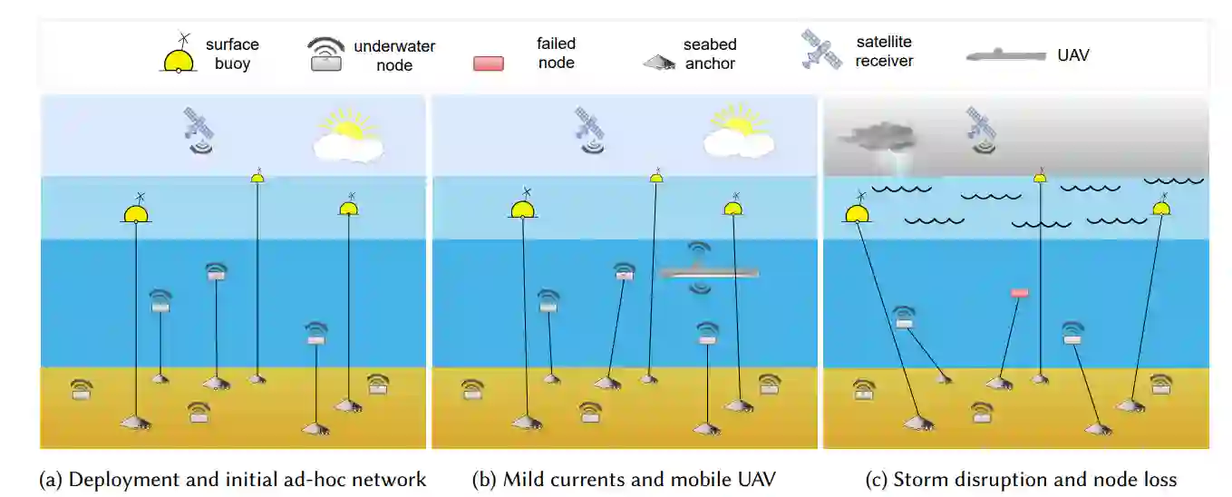 图 8. 一个常见级别 WSN 系统示意图。在图 8a 中,部署了节点并学习了初始任务优化。在图 8b 中,ATA-RIA 调整节点的动作以考虑由于电流和通过无人机的运动。在图 8c 中,节点被高度中断,一些节点出现故障。 SAS-KR 和 RT-ARP 算法可根据过去的知识和环境稳定时的探索优先级快速重新建立最佳配置。