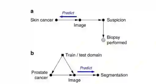 在传统因果框架中,给定X和Y为带标签的数据,X为输入图像数据,Y为目标预测数据,Z为疾病的特征。在因果关系中,X是产生Y的原因;在反因果关系中,Y产生X,即由外产生X。传统因果关系采用数据回归工具进行识别,事实上,基于材料信息的识别可能更有效。以下图为例:a图为采用皮肤癌来产生图像,进而产生所谓的疑似的判断,最后进行活体组织切片检查(biopsy),然后反过来进行判别,即通过图像识别因果类型;b图为前列腺癌例子,病例产生图像,根据图像进行分区,然后对器官或病例产生的病症进行分化,再对此进行实际估计。