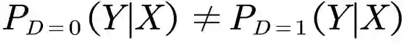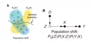 **数据迁移:人口迁移。**主要表现为人群疾病分布和斜率不同,指的是样本中人口的内在特征(例如人口统计学)不同,即 。但是,该统计结果可以直接移植,即在一个域中估计的预测值在另一个域中同样有效。这是一种常见的缓解人口转移的策略。存在一个局限性是,只有当训练数据的可变性涵盖了测试分布的支持时,它才有意义,即不能保证对训练环境中缺失的变化模式的外推性能。需要以加权分类器处理,即