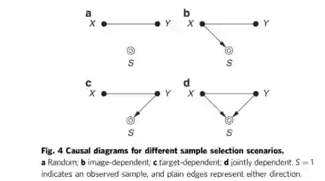 数据迁移:样本选择偏差导致的数据不匹配**。**训练和测试队列来自相同的人群,并被接受(S = 1)或拒绝(S = 0)。当选择仅依赖于图像(X→S)或目标(Y→S)时,它可以以类似于数据集移动的方式处理。当选择仅依赖于图像(X→S)或目标时(Y→S),虽然在第一种情况下 ,但目标函数可以有偏倚,可以采用相应的方法减轻数据集的偏移。当选择变量S是X和Y的共同效应时,就会出现选择偏差,一般情况下需要控制额外的变量,通过对撞机S的调节来消除X对Y的间接影响。