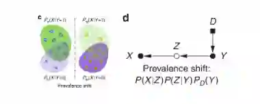 **数据迁移:流行迁移。**数据集之间的差异与类别平衡有关: 。一般,由环境因素的变化引起,或是流行率的转变中训练和测试人群中不同素质引起的。如果测试类分布Pte(Y)是先验已知的(例如,根据流行病学研究),则生成模型可以在贝叶斯规则中重用估计的外观模型 Ptr(XY ) (= Pte(XY))。对于判别模型,可以通过