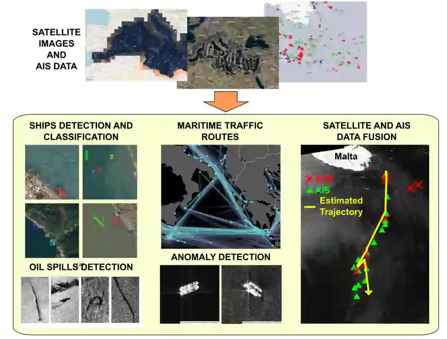 由于天基传感器技术的部署和普及,先进的数据处理范例,如大数据分析、机器学习、人工智能和数据融合技术,现在可以实现前所未有的性能,并受益于超大数据集的可用性。特别是,未来 MS 系统的开发将多种传感器(陆基和空基)与其他信息源结合在一起,需要专门的算法来处理卫星图像,尤其是船舶检测和分类、异常和环境威胁检测以及卫星和 AIS 数据融合(见图 1)。这些算法可通过处理和组织日益增多的异构信息为 MS 提供支持。从中提取的数据和易于理解的信息将帮助政府当局、国防部队、海岸警卫队和警察等最终用户检测异常情况以及漏油、海盗和人口贩运等威胁,并及时采取行动防止事故和悲剧的发生。本文分为两部分:第一部分概述了现有的主要天基传感器技术,即 Sat-AIS、SAR、MSP 和 HSP 光学传感器以及 GNSS-R,并介绍了每种技术在 MS 范围内的优势和局限性。这项工作的第二部分[8]侧重于人工智能和数据融合技术,以便从原始卫星数据中提取信息并融合这些信息,为最终用户和决策者提取有价值和可操作的知识