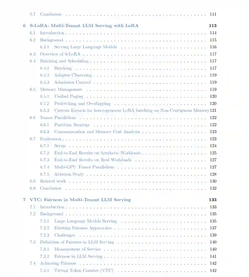 第六章(S-LoRA)旨在解决第二个需求:个性化LLM服务。低秩适应(LoRA)技术可以提供高效的、任务特定的适应,从一个基础模型中创建许多适配器,以实现成本效益高的个性化服务。LoRA适配器通过将适配器与模型参数合并来提供服务,这使得单个适配器的低延迟成为可能,但在同时服务多个适配器时会降低整体吞吐量。S-LoRA探索了LoRA适配器的可扩展服务,通过更好的内存管理、为异构批处理定制的CUDA内核和新颖的张量并行策略,实现了高吞吐量的多适配器服务。与之前的引擎相比,S-LoRA的吞吐量提高了4倍,服务的适配器数量增加了几个数量级。