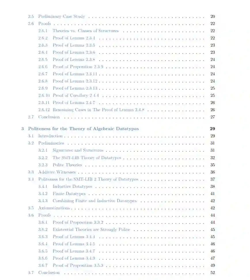 可满足性模理论(SMT)求解在自动化推理中是一种强大的技术,专门解决结合命题逻辑和背景理论的问题。与只处理真假命题的经典命题逻辑不同,SMT结合了可判定的一阶逻辑理论,如算术或等式约束。这允许对涉及整数、实数或特定数据结构的问题进行推理。SMT求解器通过系统地探索搜索空间,在指定的理论下评估公式的真值。由于将逻辑与这些理论相结合的内在复杂性,高效的求解算法和专门的决策过程对于解决现实世界的SMT问题至关重要。可满足性模理论(SMT)求解的最新技术不断发展,重点是提高效率和处理日益复杂的问题。尽管已经取得了令人瞩目的进展,但对于高度复杂的SMT问题实现可处理的解决时间仍然是一个活跃的研究领域。 本论文的第一部分涵盖了这一范围内的三个研究课题,包括更好地理解和提高理论组合的效率以及利用代数数据类型和序列的两种特定理论。在第二章中,我们对SMT中礼貌组合的研究做出了两项贡献。首先是一个困难结果,通过展示一个礼貌理论但不是强礼貌的例子,揭示了礼貌和强礼貌之间的区别。第二项贡献是对礼貌组合方法的优化,借鉴了Nelson-Oppen方法。我们展示了在某些条件下,可以减少礼貌组合所需的枚举安排的复杂性。在第三章中,我们研究了数据类型理论,并证明其是强礼貌的,展示了如何使用礼貌组合将其与其他任意不相交的理论相结合。在第四章中,我们介绍了一种用于推理向量的序列理论。与使用现有的数组理论相比,新的序列理论更具表现力,并且推理速度更快。