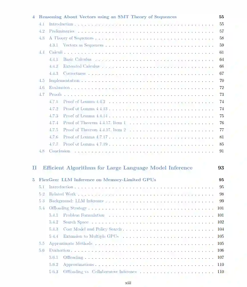 这篇论文探讨了自动化推理和大型语言模型(LLMs),通过创新算法研究如何提高这两个领域的效率和有效性。论文由三个主要部分组成,每一部分都关注人工智能的不同但相互关联的方面。 在第一部分,论文深入探讨了自动化推理领域,该领域通过计算方法模仿人类的逻辑推理。研究解决了该领域中的重大挑战,特别是随着问题复杂性的增加,计算需求呈指数级增长的情况。值得注意的是,这一部分强调了可满足性模理论(SMT)方面的进展,重点是提高在复杂性增加时的解决效率。论文通过探索理论组合、代数数据类型和序列,贡献了更高效的推理框架。