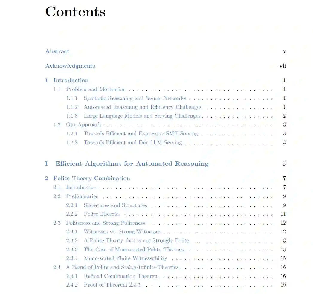 人工智能研究传统上遵循两种主要范式:符号推理和神经网络。符号推理,也称为符号AI,利用逻辑和知识表示来解决问题。这种方法在需要显式规则和推理的任务中表现出色,但在处理复杂的非结构化数据时可能会遇到困难。相反,神经网络则松散地受到大脑结构的启发,擅长模式识别和从大量数据中学习。然而,神经网络在推理过程中可能不透明,导致其可解释性较差。随着研究的进展,越来越多的研究集中在结合这两种方法,利用符号推理和神经网络的优势,开发更强大和多功能的AI系统。为了充分利用每种方法的优势,运行它们需要高效的算法和系统。在本论文中,我们首先分别关注加速自动推理的技术(第一部分)和加速大型语言模型推理的技术(第二部分)。然后,在第三部分中,我们展示了利用两者力量的初步结果。 1.1.2 自动化推理与效率挑战