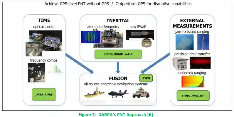 美国国防高级研究计划局拥有一个稳健、先进的定位、导航与授时和确保定位、导航与授时研究计划,以支持国防部当前和未来的定位、导航与授时需求。图3显示了美国国防高级研究计划局定位、导航与授时方法的关键要素[6]。