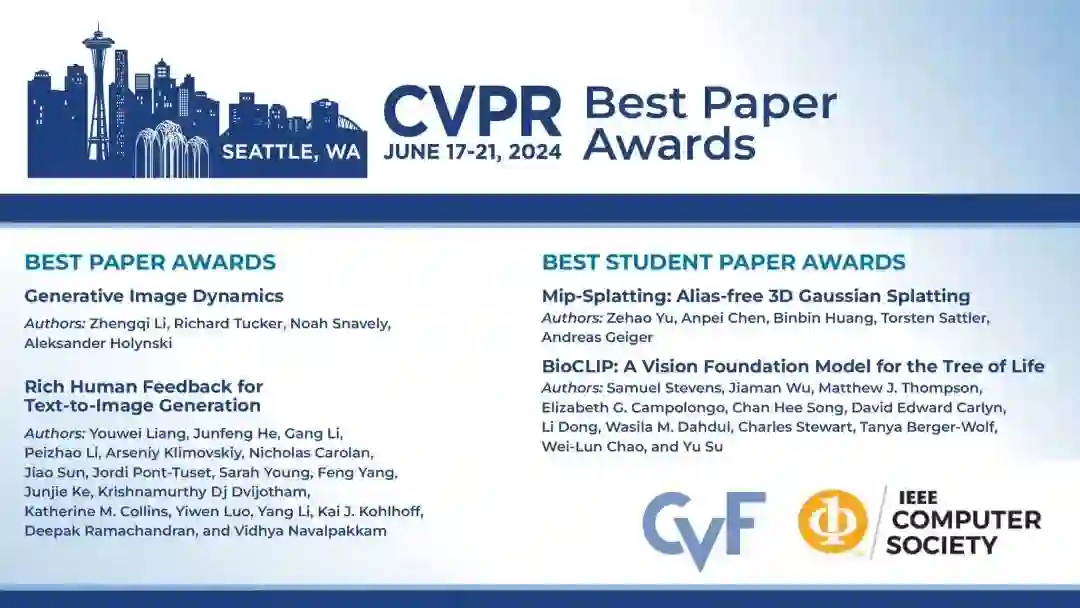 刚刚,CVPR 2024 正式公布了最佳论文、最佳学生论文等奖项。来自谷歌、美国·加州大学圣迭戈分校等2篇论文获得了最佳论文奖,来自德国·图宾根大学和OSU的研究者获得了最佳学生论文奖。