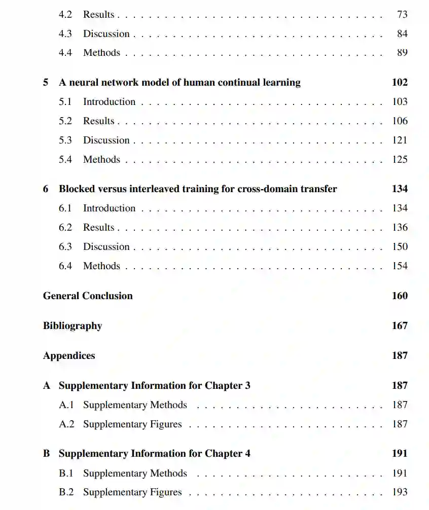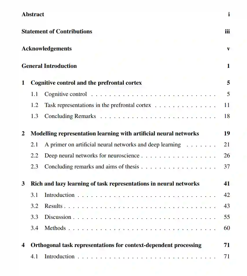 通过一系列神经网络模拟、行为和神经成像研究,以及对从macaque FEF录制的免费可用数据集的重新分析,我收集了支持早期认知控制理论的证据,该理论假设,前额叶皮质实施了有利于任务相关而非任务无关信息的门控策略,以服务于特定上下文的任务目标。在第3章中,我提出了一个计算框架,用于研究人工神经网络的上下文相关决策的表示学习,并演示了相同的架构如何学习高维和任务无关的表示,或低维和任务特定的表示。在第4章中,我在学习执行类似的上下文依赖决策任务的人类参与者的fMRI记录中测试了这些模拟的预测,发现额顶叶区域的表示是高度特定于任务的,不同任务的相关信息映射到正交编码轴上。在第5章中,我将介绍一个人类持续学习的模型,其中门控信号是通过一个简单的Hebbian机制学习的。最后,在第6章中,我测试了之前报告的blocked相比于泛化到抽象规则的交叉训练的好处,以及它们是否促进了跨域迁移。本文介绍了持续表示学习的计算理论,并提供了人类大脑使用门控策略在特定上下文的子空间中表示相关信息的经验证据。