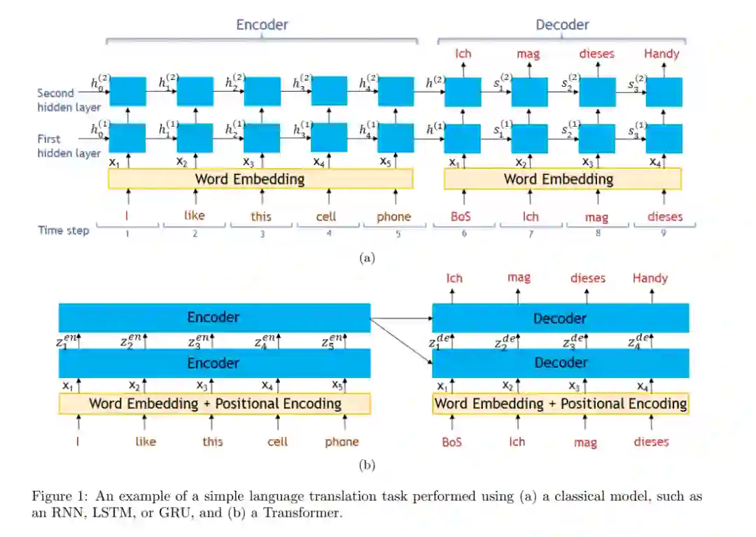 具有专门组件和架构的机器学习模型,用于处理数据的顺序性质,已经在文献中被广泛提出,并被社区使用。这些机器学习模型中最著名的是循环神经网络(RNN)及其流行的变体,包括长-短期记忆(LSTM)和门控循环单元(GRU)[35],[23],[13]。这些模型按顺序处理一批数据,每次处理一个样本,并使用著名的梯度下降算法优化未知模型参数。利用时间反向传播(backpropagation through time, BPTT)[10]计算模型参数更新的梯度信息。LSTM和GRU已成功地应用于许多领域。然而,由于输入数据的顺序处理和与BPTT相关的挑战,特别是在处理具有长依赖关系的数据集时,它们受到了一些限制。LSTM和GRU模型的训练过程中也存在梯度消失和梯度爆炸问题。在处理长序列时,梯度下降算法(使用BPTT)可能不会更新模型参数,因为梯度信息丢失了(要么接近零,要么接近无穷)。此外,这些模型通常不能从图形处理单元(GPU)、张量处理单元(TPU)和其他硬件提供的并行计算中获益。某些架构修改和训练技巧可以帮助LSTM和GRU在一定程度上减轻梯度相关的问题。然而,在现代硬件提供的有限的并行使用下,从长数据序列中学习的挑战影响了基于RNN模型[55]的有效性和效率。