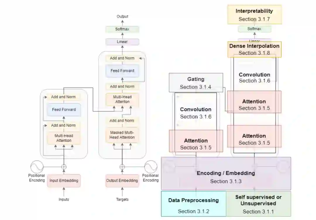 时间序列Transformers改进方法概述。左边是原始Transformer架构的重建[64]。右侧显示了第3.1小节中相对于原始Transformer模型的每个改进路径在原始体系结构中的位置。