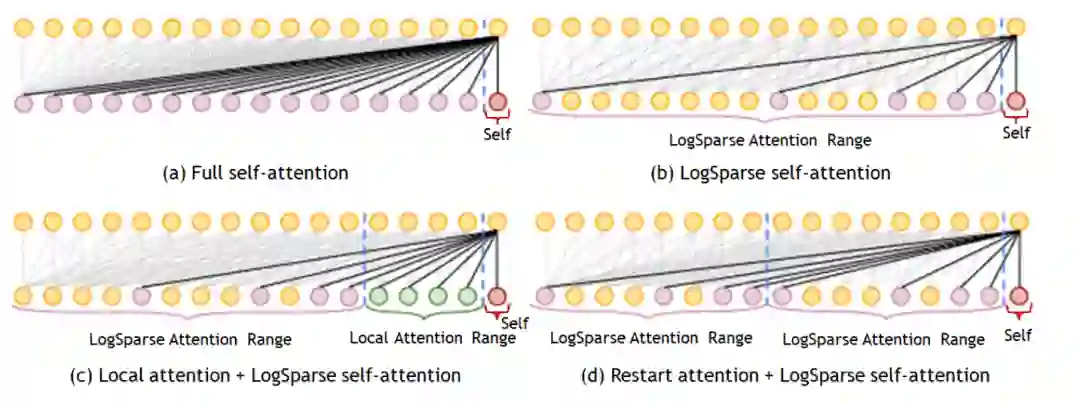 Li等人提出了LogSparse transformer来克服内存挑战,从而使transformer对于长期依赖[32]的时间序列更加可行。LogSparse transformer允许每个时间步长关注之前的时间步长,使用指数步长进行选择,将每个自关注层的内存利用率从O(l2)降低到O(llog2l)。图13显示了LogSparse自注意用于时间序列分析的各种方式。在特定范围内,用于相邻时间步长的规范的自注意力机制允许收集更多的信息。除此之外,还应用了LogSparse自注意力机制。另一种方法是在特定的时间步长范围后重新启动LogSparse步长。