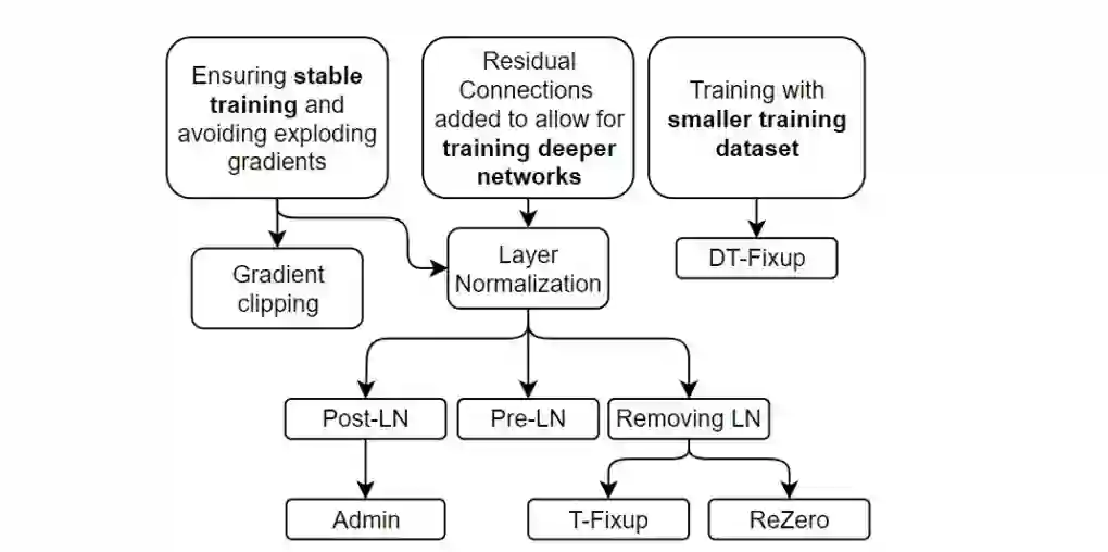 在Transformer架构中已经提出了许多改进,以解决与使用更深入的架构实现稳定训练相关的一些问题。主要是通过重新定位层归一化操作和寻找更好的权值初始化技术来平衡残差依赖关系。这些改进导致了更稳定的训练,在某些情况下,消除了使用原始架构中提出的一些策略的需要。图16提供了一些训练transformer的最佳实践的概述,以及它们各自的原因。