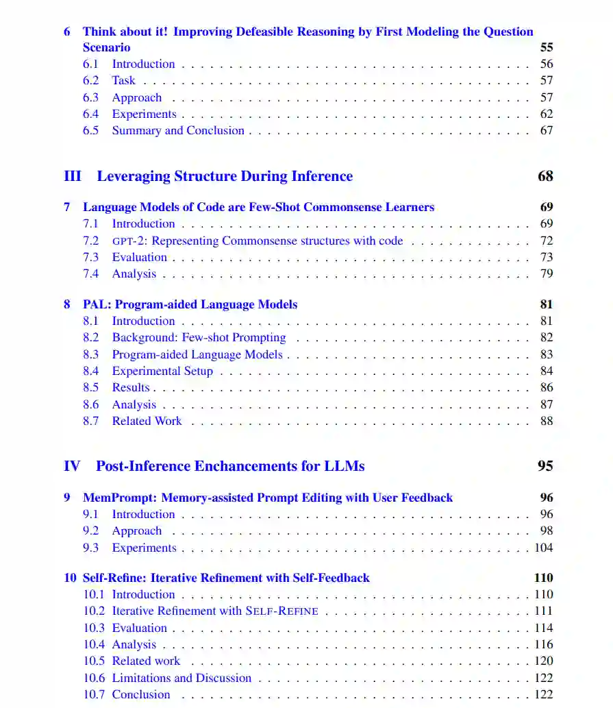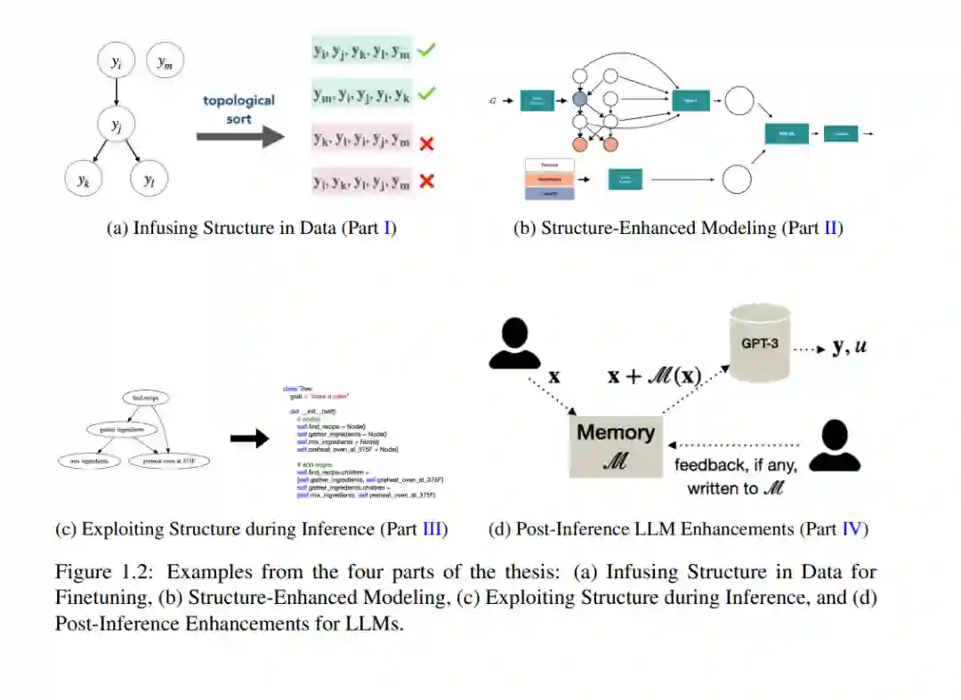 本文提出了通过在语言模型的设计和操作中整合结构化元素来解决这些局限性的方法。在此背景下,结构被定义为数据的系统性、层次性或关系性组织和表示,以及在学习和推理过程中引入结构约束。这些元素在模型开发和部署的不同阶段被整合:训练、推理和推理后。在训练阶段,我们提出了训练图辅助问答模型的技术,并发现有助于有效生成序列集的顺序。在推理阶段,我们提出了利用代码作为中间表示来整合结构的技术。在推理后阶段,我们介绍了整合记忆的方法,使模型能够利用反馈而无需额外训练。