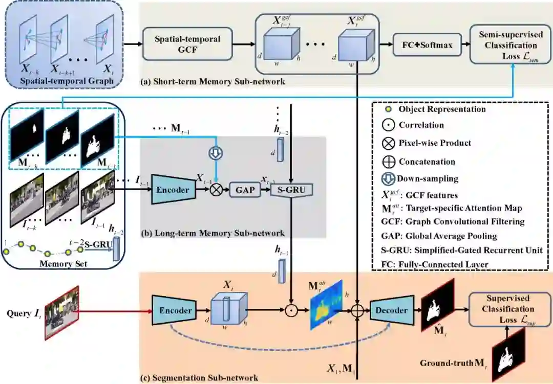 录用论文的题目为《Dual Temporal Memory Network for Efficient Video Object Segmentation》,为半监督视频目标分割方面的研究工作,旨在给定初始帧掩模标注的前提下,持续分割出后续帧中的特定目标,在多媒体领域具有重要的应用价值。现有工作往往只通过光流等技术利用短时时序信息或者通过RNN捕捉长时时序信息,没有充分利用这两种信息之间的互补特性。本工作提出了双时空记忆网络来实现视频中指定目标的分割。亮点在于:第一,提出了短时记忆子网络,利用新颖的图(Graph)结构捕捉短时时序;第二,提出了长时记忆子网络,利用匹配(Matching)方法捕捉长时时序;第三,通过分割子网络,融合短时、长时子网络的时序信息,生成分割结果。最终结果在该领域的多个公开数据集上均达到了先进水准。下图是本文的整体研究思路。