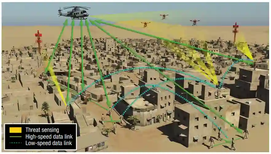 图 2. 地面 EW 网络。在这一场景中,车辆、随身系统和直升机必须相互配合,才能更好地与现有蜂窝网络和敌方无人机作战。