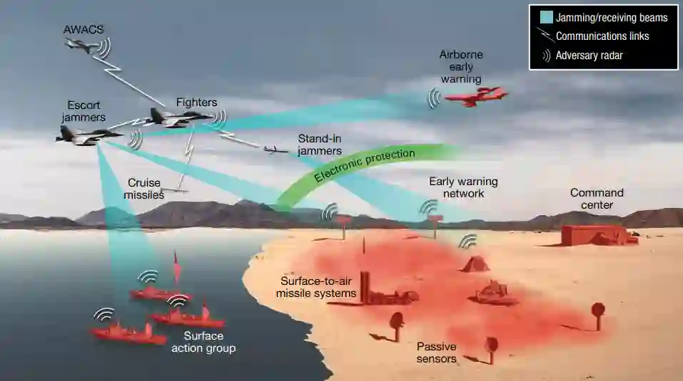 图 1. 机载 EW 网络。这个多样化的网络与海军、地面雷达和地对空导弹资产相连接。AWACS,机载预警和控制系统。