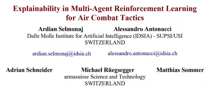本文回顾了 MARL 在可解释性方面的最新进展,并介绍了一些新颖的使用案例,这些案例突出了 MARL 在模拟空战场景(图 1-1)中分析智能体决策过程的关键作用。通过研究这些进展,我们强调了可解释性在理解和改进智能体行为方面的重要性,尤其是在应用于军事模拟等复杂环境时。我们的论文不仅仅是一份调查报告,它还探讨了可解释性如何加强战略规划、促进人类与人工智能的协作,以及确保人工智能在关键任务行动中做出的决策值得信赖。通过这些见解,我们旨在证明可解释 MARL 在高风险场景的研究和实际部署中的紧迫性。