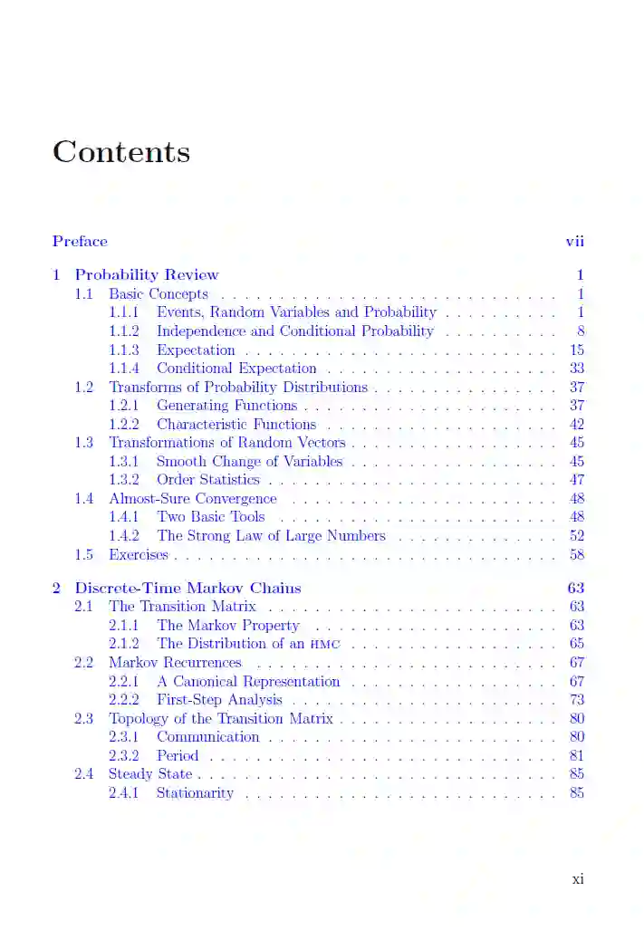 这第二版是一个彻底修订和增强版的书与相同的标题出版在1999年。作者从马尔可夫链的基本理论开始,逐步将读者带到更高级的主题。他对概率论进行了有用的回顾,使本书自成体系,并提供了一个附录,详细证明了微积分、代数和数论的所有先决条件。在每一章的结尾处都有一些精心挑选的不同难度的问题,数学是缓慢而仔细地发展的,以便使自学更容易。这本书处理了马尔可夫链理论的经典主题,在离散时间和连续时间,以及连接的主题,如有限吉布斯场,非齐次马尔可夫链,离散时间再生过程,蒙特卡罗模拟,模拟退火和排队论。 第2版增加的主要内容是Propp和Wilson的精确采样算法、电网络图上对称随机游走的类比、混合时间和分支过程的额外细节。书的结构已作了修改,以便顺利地纳入新材料。在应该提高可读性的特性中,主要有三个:定义、定理和示例的共享编号系统;示例和练习的标题归属;用蓝色标出重要的术语。结果是一本最新的随机过程教科书。 运筹学和电子工程的学生和研究人员,以及物理和生物学,将发现它非常容易获得和相关。 https://link.springer.com/book/10.1007/978-3-030-45982-6