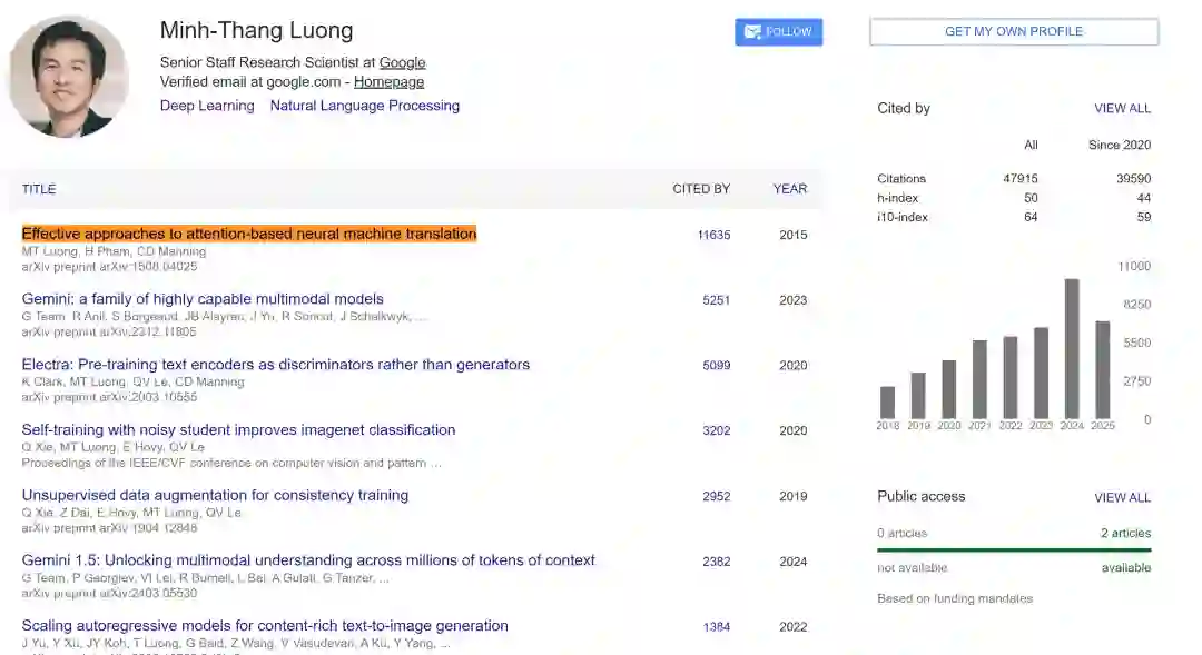 目前,该论文的被引量已经超过 1 万。论文一作 Minh-Thang Luong 博士毕业于斯坦福大学,师从斯坦福大学教授 Christopher Manning,现在是谷歌的研究科学家。