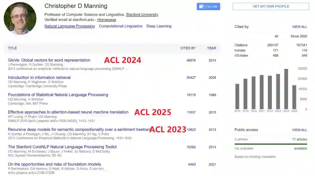 至于最后的 Manning 教授更是无需过多介绍了,这位引用量已经超过 29 万的学术巨擘为 NLP 和 AI 领域做出了非常多开创性和奠基性工作,同时还在教育和人才培养方面出了巨大贡献。