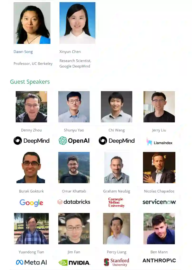 大语言模型(LLMs)已经在多个领域带来了革命性的变革。特别是,LLMs 已经被开发为能够与世界互动并处理各种任务的智能体。随着 LLM 技术的持续进步,LLM 智能体有望成为人工智能的下一个突破,它们将在智能任务自动化和个性化的支持下,彻底改变我们未来的日常生活。在本课程中,我们将首先讨论 LLM 智能体所需的一些基本概念,包括 LLM 的基础、任务自动化所需的 LLM 必备能力以及智能体开发的基础设施。我们还将涵盖一些代表性的智能体应用,包括代码生成、机器人技术、网络自动化、医学应用和科学发现。同时,我们将讨论当前 LLM 智能体的局限性和潜在风险,并分享进一步改进的方向。具体来说,本课程将包括以下内容: * LLM 的基础 * 推理 * 规划、工具使用 * LLM 智能体基础设施 * 检索增强生成 * 代码生成、数据科学 * 多模态智能体、机器人技术 * 智能体应用的评估和基准测试 * 隐私、安全性与伦理 * 人机交互、个性化、对齐 * 多智能体协作