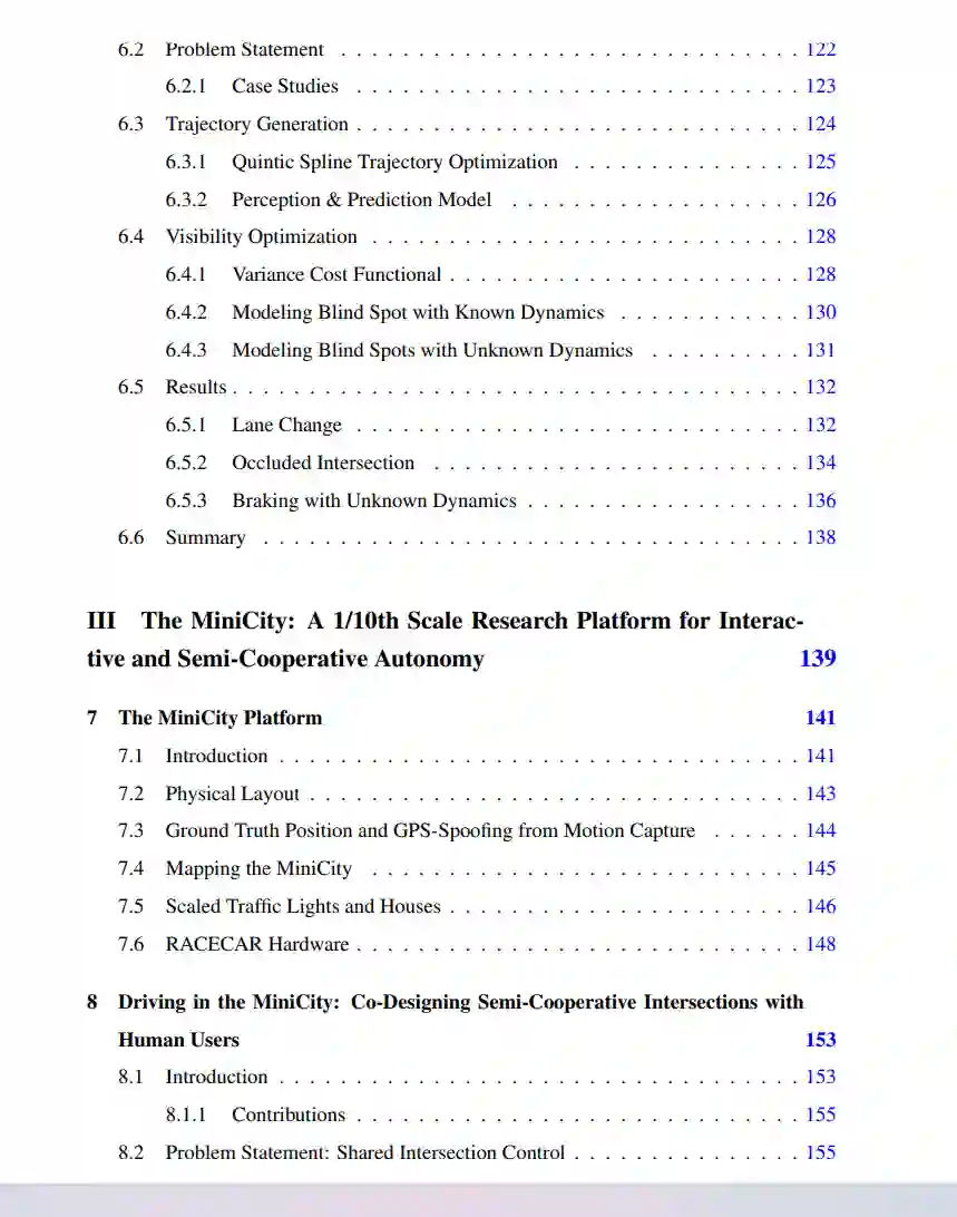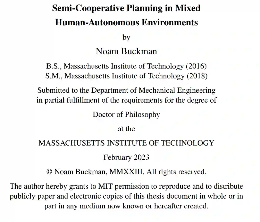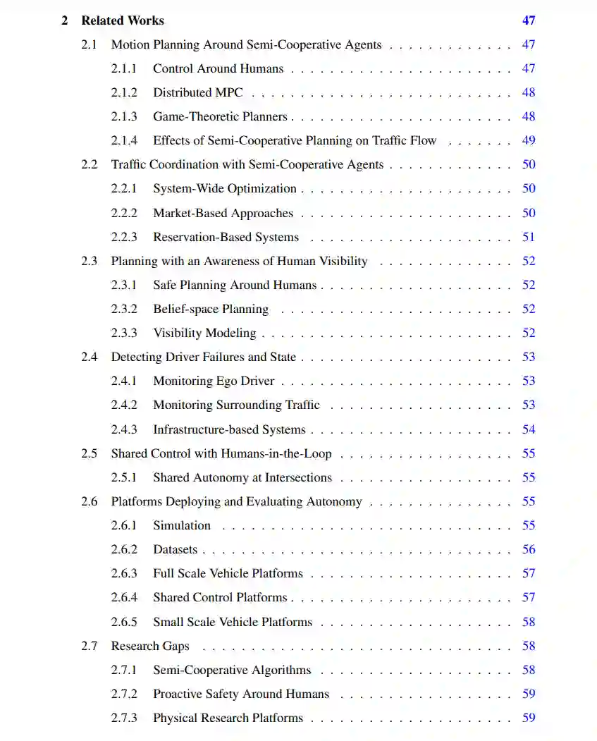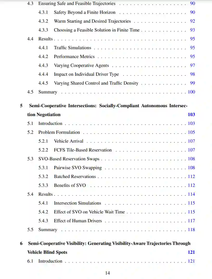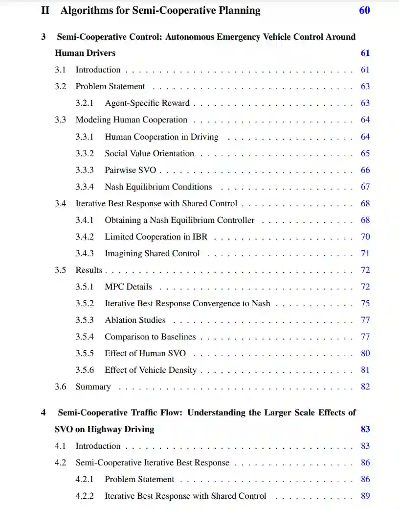 自动驾驶车辆在公共道路上的部署已取得了巨大的进展,然而在人驾车和自动驾驶车共享道路的情况下进行安全导航对于即使是最先进的系统也是一项挑战。我们需要算法和系统来为自动驾驶车辆开发和评估符合社会规范的规划算法。在这篇论文中,我们提出了一个考虑到人类操作员在车辆轨迹规划和运动控制中的社会效用的半合作自主性框架。此外,我们提出了一个新的机器人平台,用于在安全的实验室环境中部署和评估半合作自主性。在这篇论文中,我们结合了来自社会心理学的概念和博弈论规划算法,以开发半合作自主规划器。从一个自动驾驶车辆开始,我们提出了一种考虑到每个人驾驶员的社会价值取向,同时实现了可取的博弈论均衡的算法,称为"想象共享控制的迭代最佳反应"。半合作框架被应用到更大规模的系统,例如为混合人机自主交通提供符合社会规范的交叉口管理器,以及理解社会价值取向对车辆交通流的影响。此外,我们提出了一个能感知可视性的轨迹优化算法,用于围绕盲点的主动运动规划,该算法将人类驾驶员的不确定性模型纳入到半合作轨迹规划器中。我们在人类和自动驾驶车辆的模拟中演示了这些算法的有效性,并研究了人类性格对算法性能的影响。其次,我们介绍了 MiniCity,这是一个1/10比例的城市环境,包括逼真的城市景观、交叉口,以及配备了最先进传感器和算法的多个完全自动驾驶的1/10比例车辆。我们描述了 MiniCity 机器人平台如何用于半合作自主性的开发,从评估算法性能到开发新的智能交通系统。首先,我们使用 MiniCity 来评估车辆自主性,既测量上游感知对下游车辆性能的影响,又测量半合作交叉口管理器的效率。其次,我们利用 MiniCity 的人在环路驾驶员界面收集用户偏好,用于共同设计穿越交叉口的共享控制器。最后,我们提出了一种新的基于基础设施的故障检测算法 FailureNet,该算法在 MiniCity 的自动驾驶车辆上进行训练和部署。在所有这些中,MiniCity 为开发交互式算法提供了一个安全和可扩展的环境,使我们更接近在混合人工自主驾驶的道路上完全部署符合社会规范的自主性。