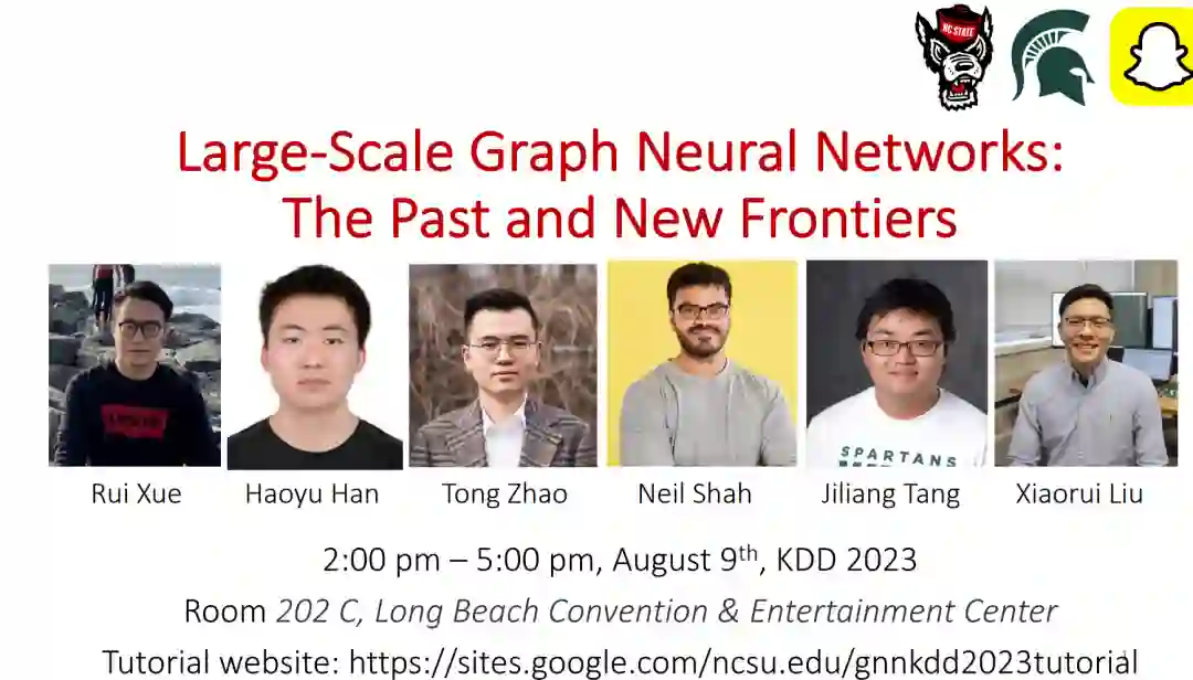 图神经网络(GNNs)近年来受到了大量关注,因为它们能够模拟图结构数据中实体之间的复杂关系,例如社交网络、蛋白质结构和知识图谱。但由于真实世界工业图的大小和GNNs的特殊结构,使得在大规模图上部署GNNs对工程师和研究者来说一直是一个持久的挑战,这大大限制了它们在实际应用中的应用。在本教程中,我们将介绍GNNs的基本可扩展性挑战,包括大规模GNNs的前沿,包括经典方法和一些新兴的技术,对可扩展GNNs的评估和比较,以及它们的大规模实际应用。总体来说,本教程旨在为扩展GNNs提供一个系统而全面的理解。对未来方向的总结和讨论将激励工程师和研究者在这个迅速发展的领域探索新的想法和发展。图神经网络(GNNs)介绍(25分钟)(a) GNNs的基础(b) GNNs的应用(c) 大规模GNNs的可扩展性挑战扩展GNNs的经典方法(60分钟)(a) 采样方法(b) 解耦方法(c) 分布式方法休息:5分钟扩展GNNs的新兴技术(60分钟)训练:(a) 延时传播(b) 交替训练(c) GNN预训练推断:交模型提取数据:(a) 图压缩(b) 子图草图(c) 制表评估、比较和应用(20分钟)总结和未来方向(10分钟)