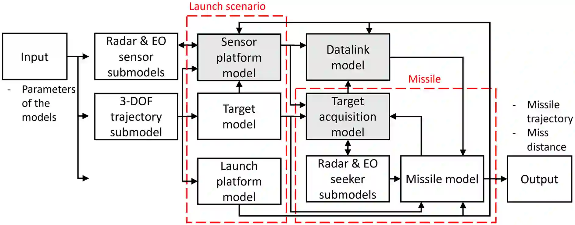 MisDA 由描述导弹、目标、发射平台(LP)、传感器平台(SP)、DLU 生成和目标捕获的模型组成。MisDA 的结构如图 2 所示。本文描述的模型以灰色标出,之前介绍的模型以白色标出。