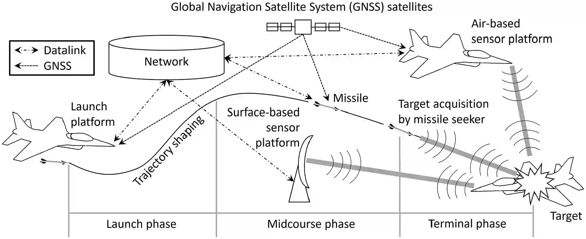 飞机的作战生存能力取决于对敌方探测和火力的控制。因此,现代空战几乎全部使用超视距导弹(BVR)。因此,现代空战几乎都使用超视距导弹(BVR)。要提高生存能力,就必须努力提高导弹的运动射程。设计人员试图通过进一步开发导弹火箭发动机和采用空气呼吸导弹发动机来实现这一改进。本文讨论的现代空对空导弹(AAM)使用主动雷达或被动光电红外寻的器。Stillion、Fleeman、Eichblatt、Norman 和 Watson 的著作中包括了这类导弹的实例。受可用空间和电力以及成本因素的限制,寻的器的探测距离仍然大大低于导弹的运动距离。因此,在目标进入寻的器的探测范围之前,需要持续的外部目标数据为导弹提供支持。