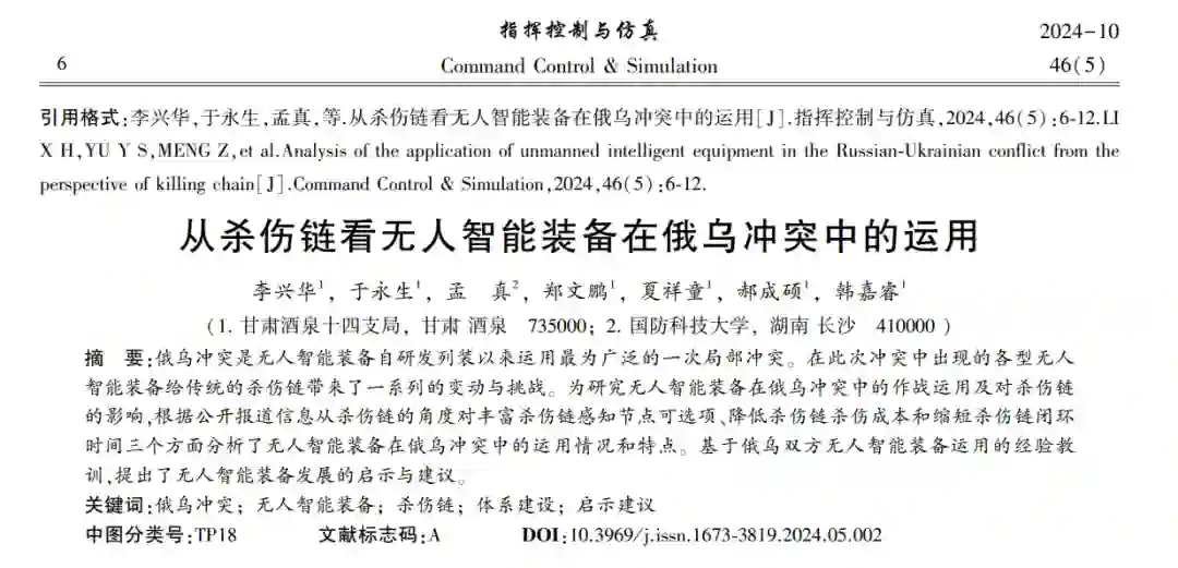 杀伤链是作战单元完成从发现到摧毁目标的一系 列有序闭环操作及相关活动的统称,其核心目的是对 敌方战争力量杀伤的赋能。 杀伤链的发展与战争形式 及武器装备息息相关,随着机械化、信息化和智能化时 代的到来,有关杀伤链模型的描述不断被更新、发展和 完善[1] 。 为了达成作战行动的目的,参战各方都在不 遗余力地追求和创造高效、适应、可靠、协调的杀伤链, 如何缩短杀伤链的闭合时间,增强链条环节中的杀伤 效果,同时避免大规模的人员伤亡成为各国关注的热 点之一。 基于此,无人智能装备的开发与运用无疑是 较优的解决方案。 无人智能装备是指借助自主控制和人工智能技 术,具备一定程度的智能指挥决策和自主行动能力,能 够以单独或协同方式实施进攻或防御等作战任务的无 人化武器装备[2] 。 当前,无人智能装备的发展方兴未 艾,但其在杀伤链的各节点中扮演何种角色,发挥何种 效能,催生出何种形式,仍处于认知迷雾状态。 2022 年 2 月,俄乌冲突爆发,一年多的时间内,俄乌双方均大量 使用了无人智能装备,包括无人机、无人车、无人艇等, 这为无人智能装备在杀伤链中的具体运用提供了较多 的分析素材。 本文从杀伤链的角度分析了无人智能装 备的使用情况及特点,提出了相关的启示和建议。