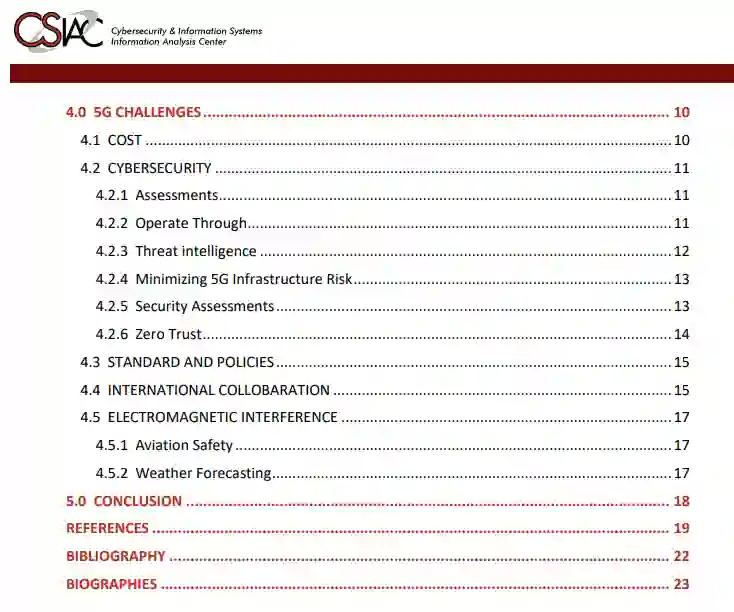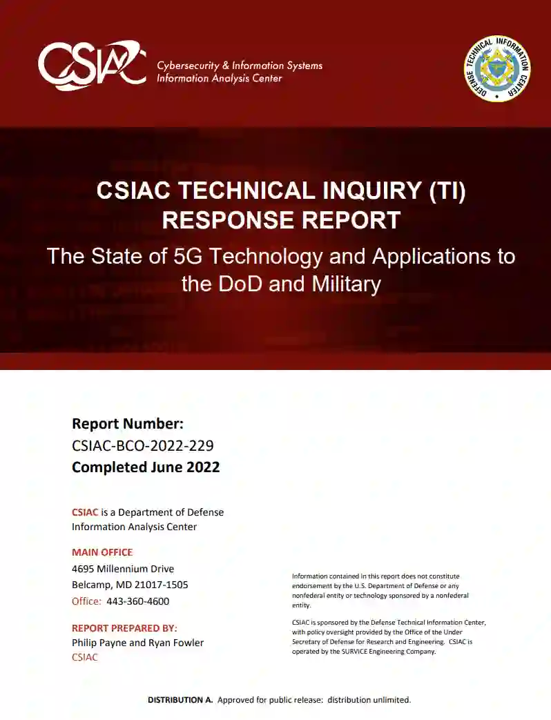 第五代无线通信技术(5G),有可能改变通信系统。5G移动网络将提供更高的速度、更低的延迟、更高的可靠性、更多的网络容量和更多的互连性。随着5G技术在原有系统和新系统中的部署、现代化和实施,预计会有巨大的改进。近年来,随着各行各业都希望在新技术的风口浪尖上有所创新,对5G技术的投资和兴趣也呈指数级增长。充分利用这项技术将推动工业和美国国防部(DoD)的能力在未来有巨大的改进,如更高的性能和更高的效率。本报告重点介绍该技术的现状和国防部的具体使用案例。