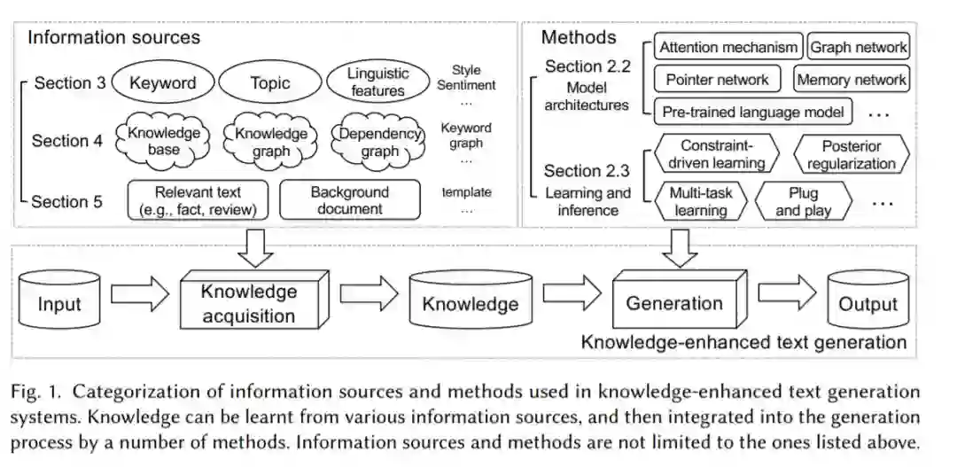 文本生成的目标是让机器用人类语言表达。它是自然语言处理(NLP)中最重要也是最具挑战性的任务之一。自2014年以来,各种由Seq2Seq首创的神经编解码器模型被提出,通过学习将输入文本映射到输出文本来实现这一目标。然而,仅凭输入文本往往无法提供有限的知识来生成所需的输出,因此在许多真实场景中,文本生成的性能仍然远远不能令人满意。为了解决这个问题,研究人员考虑将输入文本之外的各种形式的知识纳入生成模型中。这一研究方向被称为知识增强文本生成。在这项综述中,我们提出了一个全面的综述,在过去的五年里,知识增强文本生成的研究。主要内容包括两部分:(一)将知识集成到文本生成中的一般方法和体系结构;(二)根据不同形式的知识数据的具体技术和应用。这项综述在学术界和工业可以有广泛的受众,研究人员和实践者。