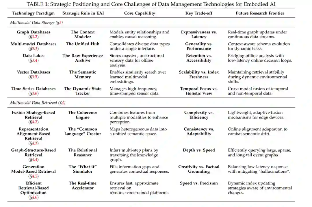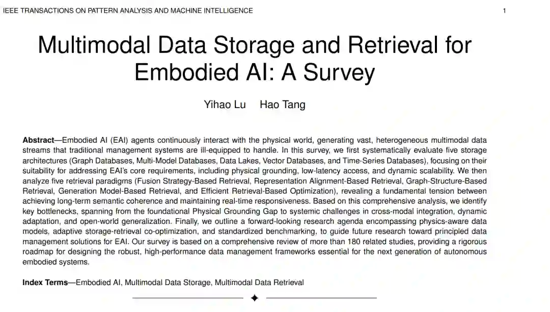 摘要—具身人工智能(Embodied AI, EAI)智能体持续与物理世界交互,产生海量且异质性的多模态数据流,而传统的数据管理系统难以有效应对这一挑战。在本综述中,我们首先系统性地评估了五类存储架构(图数据库、多模型数据库、数据湖、向量数据库以及时序数据库),重点分析了它们在满足 EAI 核心需求方面的适用性,包括物理具身性(physical grounding)、低延迟访问以及动态可扩展性。随后,我们探讨了五类检索范式(基于融合策略的检索、基于表征对齐的检索、基于图结构的检索、基于生成模型的检索以及基于高效优化的检索),揭示了在实现长期语义一致性与保持实时响应性之间的根本张力。在这一全面分析的基础上,我们识别出若干关键瓶颈,从基础性的**物理具身鸿沟(Physical Grounding Gap)**到跨模态融合、动态适应与开放世界泛化等系统性挑战。最后,我们提出了前瞻性的研究议程,包括面向物理的感知数据模型、自适应的存储-检索协同优化以及标准化基准测试,以推动未来面向 EAI 的系统性数据管理解决方案的发展。本综述基于对 180 余篇相关研究的全面梳理,旨在为下一代自主具身系统所需的稳健、高性能数据管理框架提供严格的设计路线图。 关键词—具身人工智能,多模态数据存储,多模态数据检索