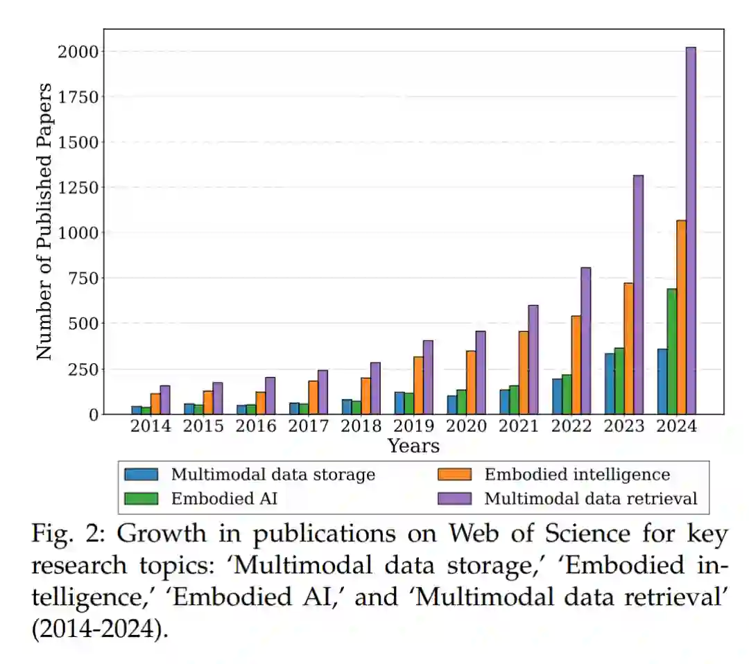 具身 AI 与多模态数据管理相关文献的快速增长凸显了本综述的必要性(趋势如图 2 所示)。这两个快速发展的研究领域在交汇点上亟需系统性的回顾与梳理。本文综述旨在系统性审视面向具身智能的多模态数据存储与检索方法,综合近期进展并强调未来关键研究机遇。本文的主要贡献包括: 1. 填补研究空白:尽管具身智能高度依赖多模态数据处理,但针对其交互性与物理具身特性的数据存储与检索综述仍十分有限。 1. 促进跨领域创新:我们探讨了已有的多模态数据方法如何被改造,以应对具身智能系统中的实时性、空间性和感知处理等独特挑战。 1. 明确未来方向:通过分析现有瓶颈,我们提出针对性的优化策略,并勾勒出未来研究的潜在路径。
