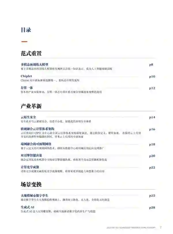 1月11日,阿里巴巴达摩院发布《2023十大科技趋势》。 达摩院今年推出的十大科技趋势涵盖范式重置、产业革新和场景变化三大领域,其中有些趋势——例如多模态与训练大模型和生成式AI的价值已经开始在现实社会有所显现,有些趋势——例如Chiplet和存算一体等技术正在引起全社会的深入思考,有些趋势——例如云原生安全则提出了非常广阔的命题并需要越来越多的人投入其中才能予以兑现。 展望 2023,多元技术的协同并进驱动计算与通信的融合、硬件和软件的融合,应用需求的爆发驱动 AI 技术与行业的融合,数字技术与产业生态的融合,企业、个人与政府在安全技术与管理上的融合。科技进步与产业应用双轮驱动的融合创新已成为不可逆转的宏大趋势。 范式重置