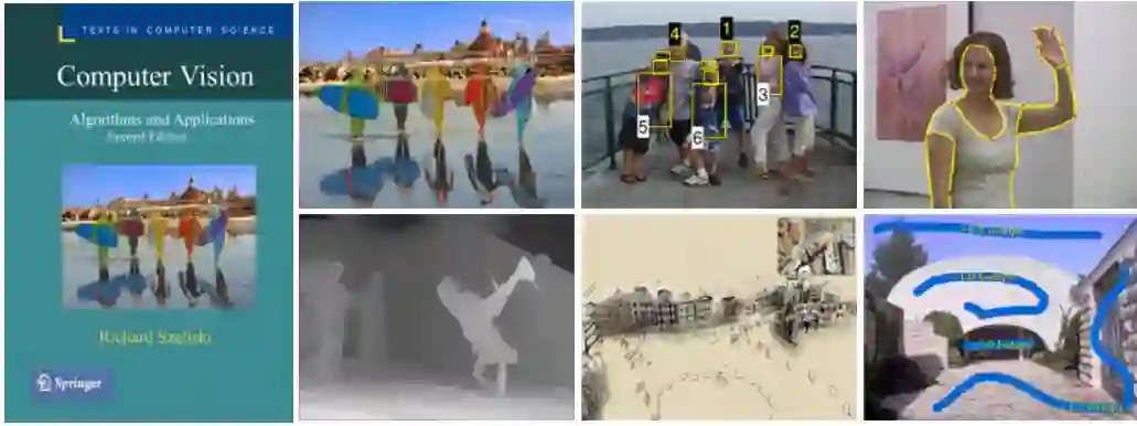 在课程教学过程中,我们发现,要使学生从容应对真实图像及其带来的挑战,让他们尝试实现一些小的课程设计(通常一个建立在另一个基础之上),是很有帮助的。随后,要求学生分成组选择各自的主题,完成最终的课程设计。(有时,这些课程设计甚至能转换为会议论文!)本书各章最后的习题包含有关小型中期课程设计题目的很多建议,也包含一些更开放的问题,这些问题的解决仍然是活跃的研究课题。只要有可能,我都会鼓励学生用他们自己的个人照片来测试他们的算法,因为这可以更好地激发他们的兴趣,往往会产生富有创造性的衍生问题,使他们更熟悉真实影像的多样性和复杂性。