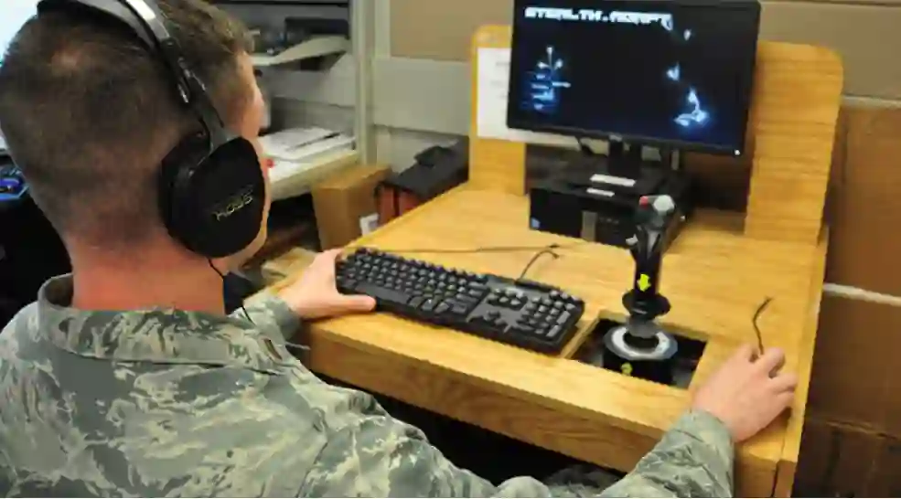 一名美空军军官正在操作一款电脑游戏,该游戏旨在帮助美国海军发现遥控无人车(UxV)的未来操作员。(美国空军上士 Alexx Pons 拍摄)。