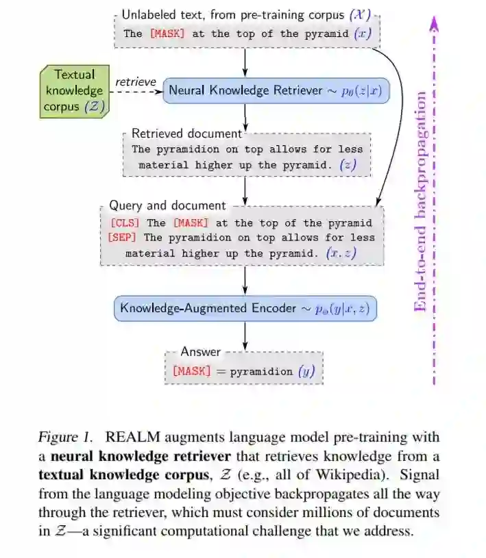 使用掩码语言建模作为学习信号,并通过一个考虑数百万文档的检索步骤进行反向传播。