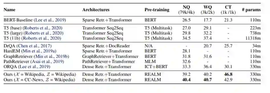 通过对具有挑战性的开放领域问题回答(Open-QA)任务进行微调,我们证明了增强语言模型预训练(REALM)的有效性。我们比较了三种流行的开放qa基准上的最先进的显式和隐式知识存储模型,发现我们的性能显著优于所有以前的方法(4-16%的绝对准确性),同时还提供了定性的好处,如可解释性和模块化。
