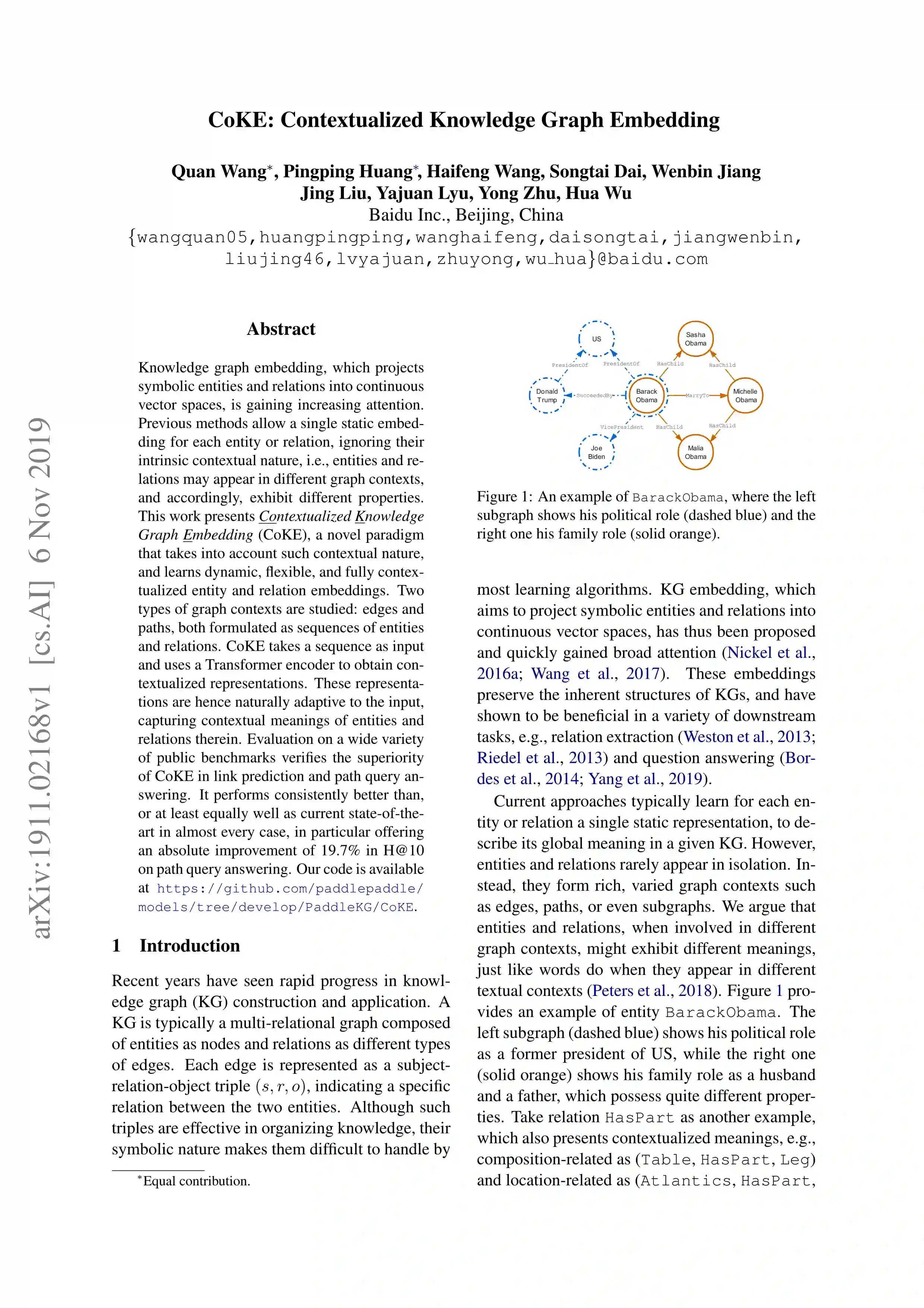 论文摘要:知识图谱嵌入是一种将符号实体和关系投影到连续向量空间的方法,越来越受到人们的重视。以前的方法允许对每个实体或关系进行单一的静态嵌入,忽略它们的内在上下文性质,即。,实体和关系可能出现在不同的图上下文中,因此,它们具有不同的属性。该工作提出了一种新的基于上下文的知识图谱嵌入(CoKE)范式,该范式考虑了这种上下文性质,并学习了动态的、灵活的、完全上下文化的实体和关系嵌入。研究了两类图的上下文:边和路径,它们都被表示为实体和关系的序列。CoKE采用一个序列作为输入,并使用Transformer编码器获得上下文化的表示。因此,这些表现形式自然地适应输入,捕捉实体的上下文含义和其中的关系。通过对各种公共基准的评估,验证了CoKE在链路预测和路径查询应答方面的优越性。在几乎所有情况下,它的性能始终比当前的技术水平更好,或者至少与之相当,特别是在H@10的路径查询应答方面提高了19.7%。