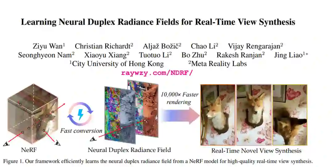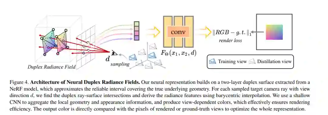 神经辐射场(NeRFs)能够以前所未有的视觉质量实现新视图合成。然而,为了渲染出逼真的图像,NeRFs需要对每个像素进行数百次深度多层感知器(MLP)评估。这在成本上是难以承受的,甚至在强大的现代GPU上也无法实现实时渲染。在本文中,我们提出了一种新颖的方法,将NeRFs提炼并烘焙到高效的基于网格的神经表示中,这种表示与大规模并行的图形渲染管道完全兼容。我们将场景表示为编码在双层复式网格上的神经辐射特征,通过学习来自可靠射线-表面交点区间的聚合辐射信息,有效地克服了3D表面重建中固有的不准确性。为了利用附近像素的局部几何关系,我们使用屏幕空间卷积代替NeRFs中使用的MLP来实现高质量的外观。最后,整个框架的性能通过一种新颖的多视图提炼优化策略得到进一步提升。我们通过在一系列标准数据集上进行广泛实验,证明了我们方法的有效性和优越性。