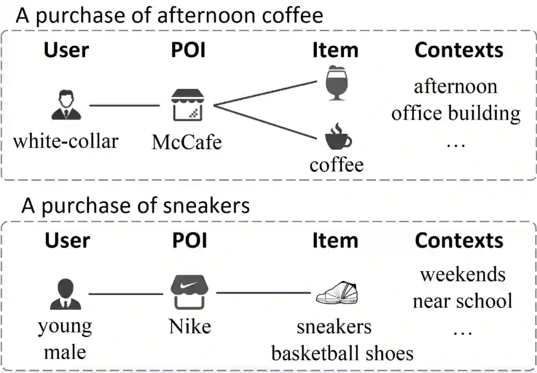 尽管交互数据的聚类已经得到了广泛的探索,但实际中的交互数据仍然要更加复杂得多。在实际应用中,一个完整交互通常会包含多个带有属性的交互对象和如时空上下文的交互环境。例如,在电子购物领域中,如上图所示,一个完整交互包括但不限于"什么人在什么情况下在哪个商店购买了什么商品"。此外,完整交互的每一个部分对于发现交互模式都很必要。如上图上半部分所示,白领为了高效工作经常在下午点咖啡。如果我们忽略这种时间上下文中"下午"的条件,可能会得出一种片面的模式,从而可能导致在午夜向其推荐咖啡,而这违反了常识。然而,现有的聚类方法仅对真实交互中的部分信息进行了建模和利用,即要么将整个交互分解为了若干个成对的子交互以进行简化,要么只专注于对某些特定类型的交互对象进行聚类,而不是针对完整交互。因此,现有的聚类方法无法全面表征和利用完整交互过程中的信息。此外,从完整交互中选择出重要属性也可对聚类结果作出更准确的解释。相反,基于交互的不完整的建模,则可能会遗漏一些有助于解释的关键信息,例如上例中的"下午"。但是到目前为止,很少有人尝试探索完整交互中的丰富属性以进行聚类解释。