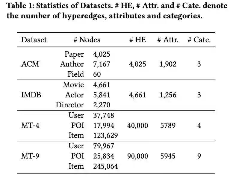在属性较少的数据集上,即ACM和IMDB,纯结构方法,尤其是经典的node2vec,比纯属性方法K-means和AE表现更好。此外,同时考虑属性和图结构的方法,例如HGT,通常会进一步提高集群性能,验证了同时考虑属性和结构的优势。虽然基于超图的基线方法仅获得相对较差的性能,但我们的CIAH仍然获得了最好的性能,这证明了并不是简单地应用超图来集成信息,就一定可以获得效果的提升。而对于属性丰富的数据集,即MT-4和MT-9,情况并非如此。仅靠属性的方法的性能,就已经远远超过了仅考虑结构的方法甚至可以超过结合属性和图结构的方法。但是,基于超图的方法可以取得明显更好的结果,这验证了将完整交互建模为超图的必要性。尤其是在推荐领域,为每一次交互引入一个汇总节点只能建模成对的交互关系,而实际上一个完整交互是一个不可分割的整体。因此强行将其拆分为若干个成对的子关系会导致信息丢失,这再次验证了我们模型的有效性。