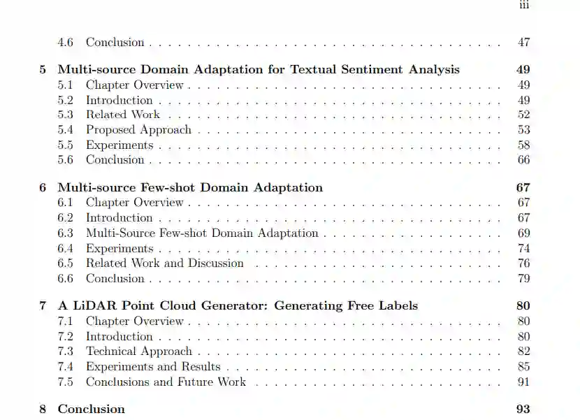 在本论文中,我将介绍在不同场景下学习可迁移表示的许多方法,包括1) 当源域只有有限的标签,甚至每个类只有一个标签时,2) 当有多个标记源域时,3) 当有多个未标记的目标域时。这些方法在不同的数据模态(如视觉和语言)中是通用的,并且可以很容易地组合起来解决其他类似的领域转移设置(如从具有有限标签的多个源适应),使模型能够泛化到源域之外。许多工作将知识从模拟数据转移到真实数据,以减少对昂贵的手动注释的需求。最后,介绍了我们在构建LiDAR 点云模拟器方面的开创性工作,进一步实现了LiDAR 点云分割的大量领域适配工作。