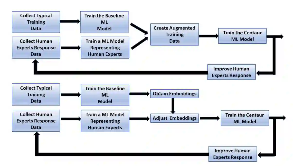 图 1:创建半人马的两种现代方法。上图:通过输入代表人类专家直觉的 ML 模型的输出来增强基线 ML 模型(见,例如,[7])。下图:通过直接调整嵌入或 ML 模型的其他方面(如为底层神经网络添加一层)来创建半人马(见,例如,[40])。