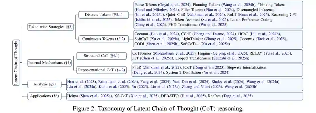 尽管存在未解难题,潜在推理研究发展迅速且碎片化,亟需研究社区对其进行清晰、系统的梳理。为此,我们提出首个潜在思维链推理的全面综述,贡献如下: 1. 系统化分类:提出潜在 CoT 研究的结构化分类框架,将现有工作划分为四大方向,并在各方向内部对代表性研究进行系统梳理,阐明其方法假设与创新(见图 2)。 1. 深入分析:基于该分类,对各类别代表性工作进行综合分析,比较其训练策略、设计范式、监督信号与效率权衡。 1. 挑战识别与前沿展望:总结潜在 CoT 领域的关键开放问题,并展望未来值得关注的研究方向。