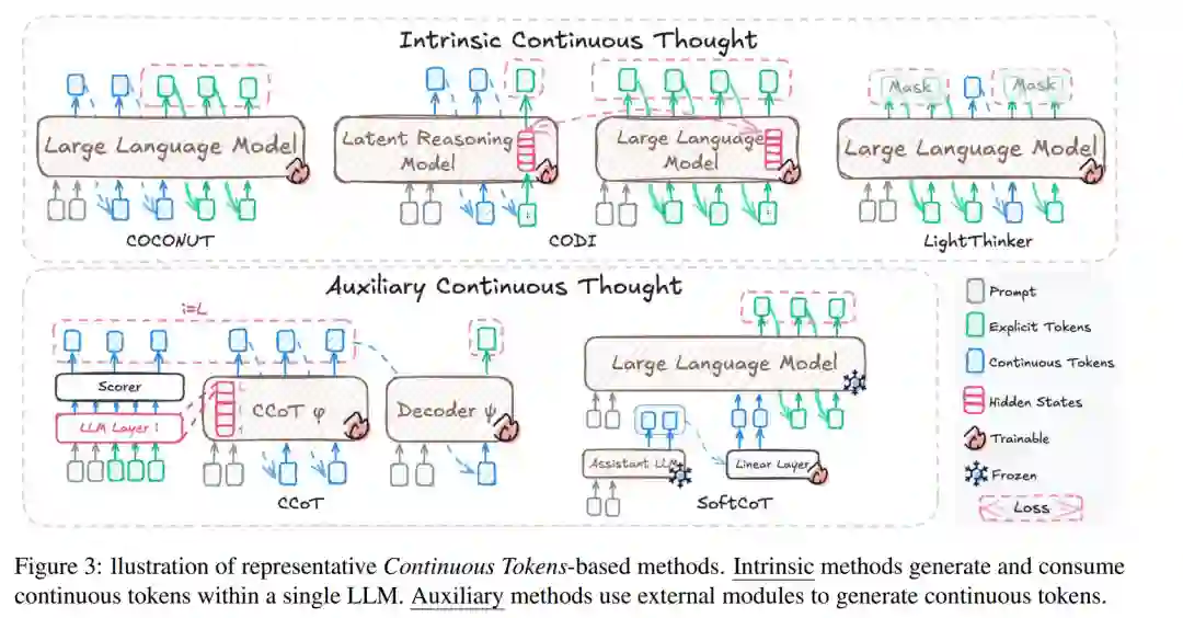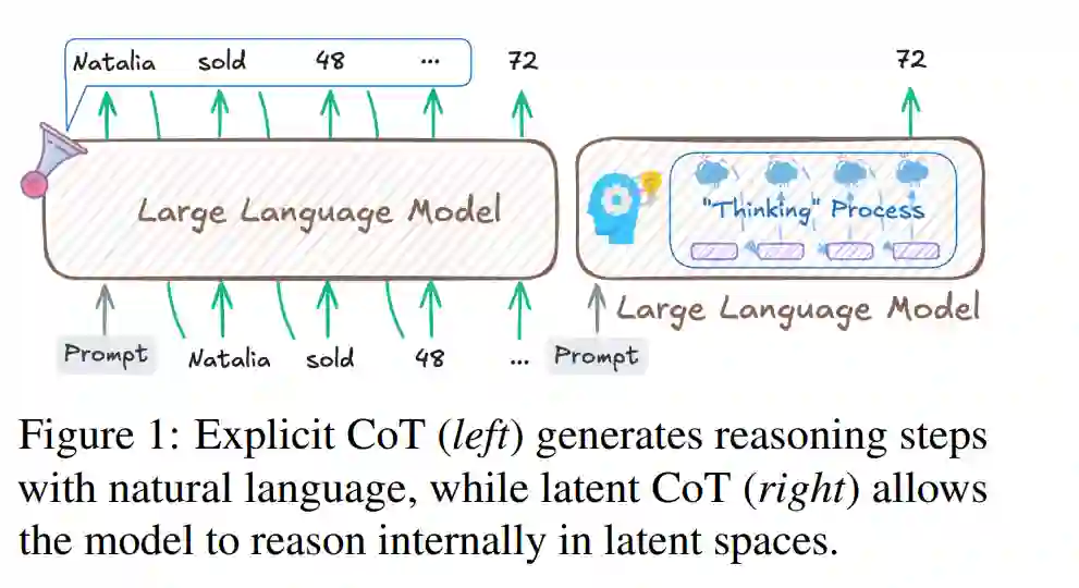 “凡不能言说之事,当保持沉默。”——路德维希·维特根斯坦 大型语言模型(Large Language Models,LLMs)借助思维链(Chain-of-Thought,CoT)推理,在复杂推理任务中展现了卓越能力(Guo 等,2025;OpenAI,2025;Qwen,2025;Wei 等,2022;Chen 等,2025b)。CoT 通过引导模型以自然语言逐步推理,不仅提升了可解释性,还常常带来更优的任务表现(Kojima 等,2022;Chu 等,2024)。 然而,显式 CoT 推理受限于必须用自然语言记录每一步推理,导致两大问题: 1. 计算效率低下——并非所有生成的 token 都携带有用信息(Lin 等,2025b;Feng 等,2025;Qu 等,2025;Sui 等,2025;Wang 等,2025a;Liu 等,2025); 1. 思维表达受限——人类认知常常超越语言,可包含抽象洞见、直觉跃迁或高度组合式思考,这些内容难以完全或准确地口头化(Wittgenstein,1922;Pinker,1994)。正如 Hao 等(2024)指出,强行将每一步都显式化不仅困难,还对推理本身造成不自然的束缚。