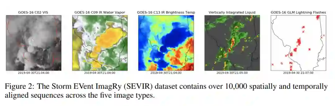 创建风暴事件图像(SEVIR)数据集以解决此问题[5]。SEVIR将多种不同的天气传感模式(包括地球同步卫星图像、闪电探测和雷达)组合成一个人工智能就绪数据集,用于研究气象学中的几个问题。SEVIR包含超过10万个事件,每个事件由384公里x 384公里的图像序列组成,时间跨度为4小时。SEVIR中的许多事件都是根据国家环境信息中心风暴事件数据库选择的。